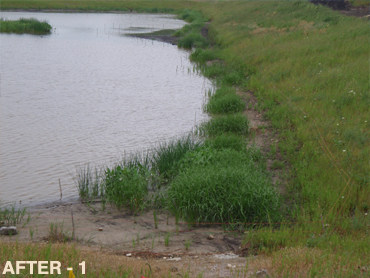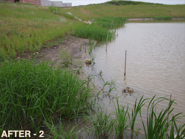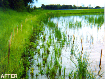 The current seed-bank was allowed to grow and the Cattails were herbicided. Native shoreline plants were installed afterward for better results and less long-term maintenance. |